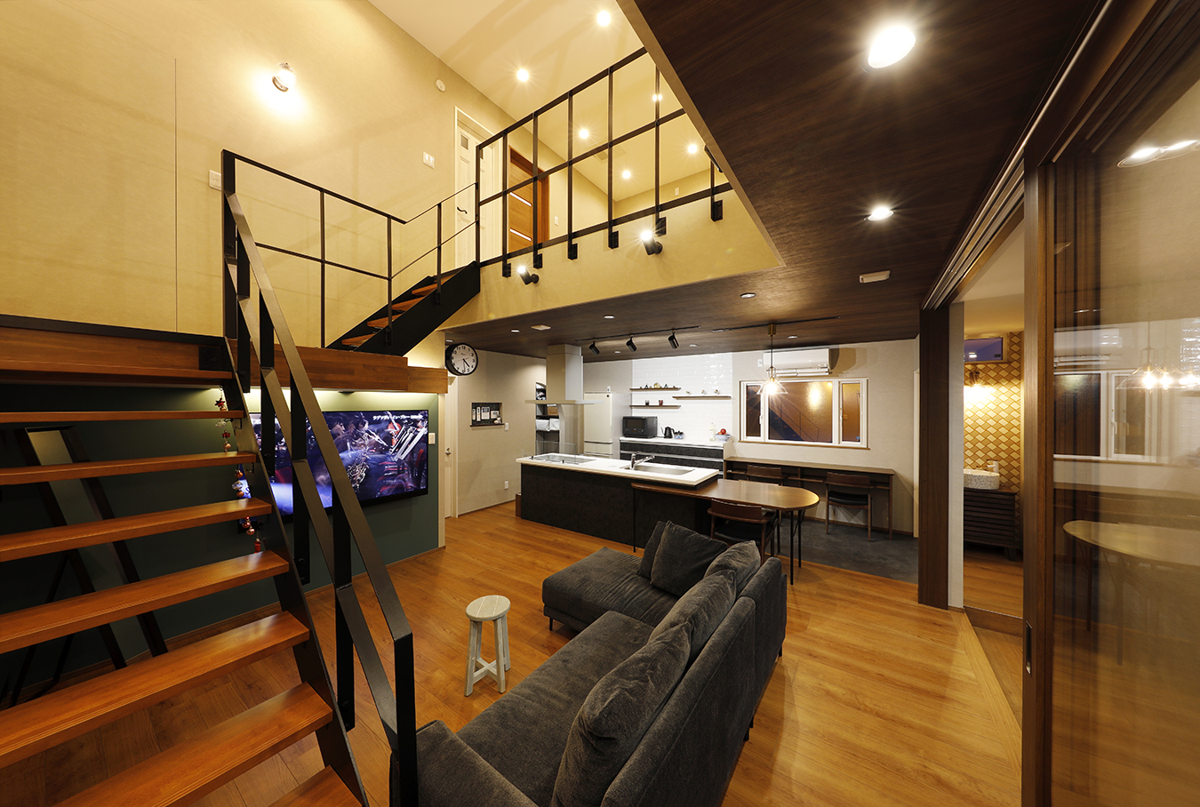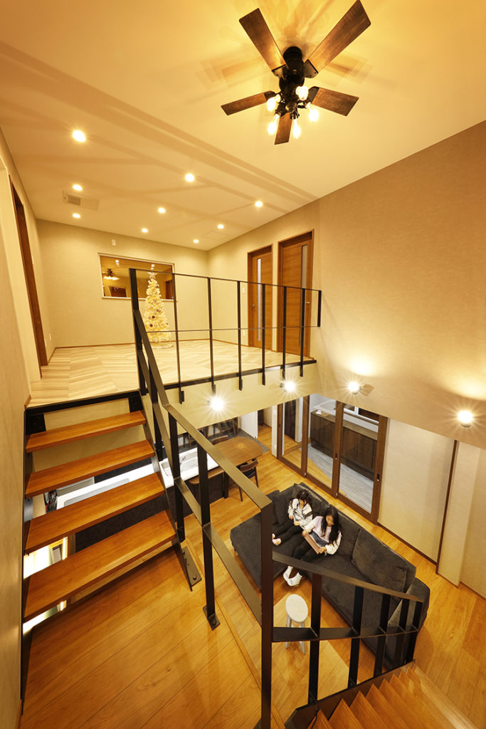 吹き抜けのリビングから続くアイアン階段。中二階にある隠し扉は、施主様拘りの隠れ部屋へと続きます。