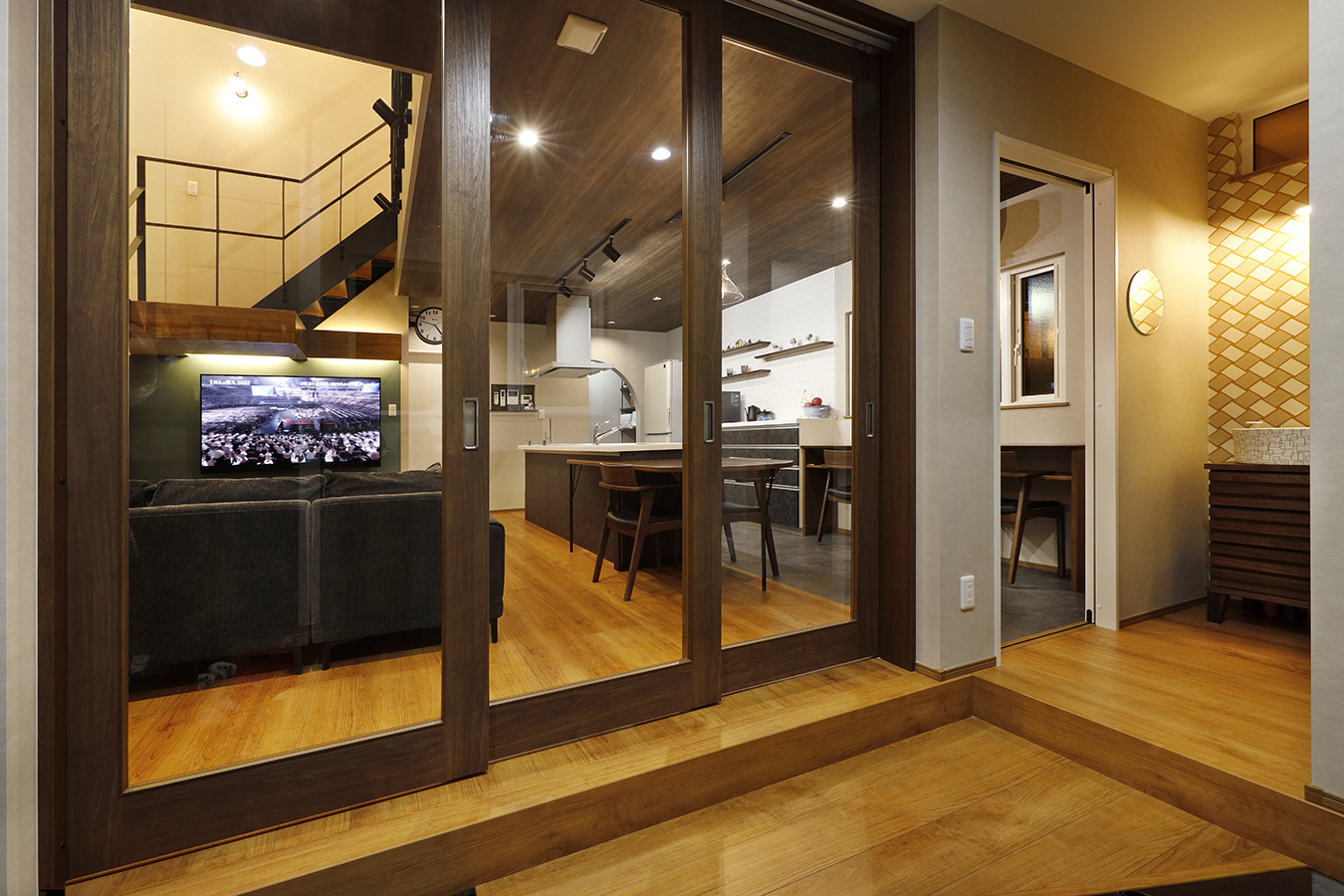 玄関土間からLDKに連続的につながる空間は、ウォールナットが基調となり、まるでカフェに来たような雰囲気。施主様チョイスの時計もいいアクセントになっています。